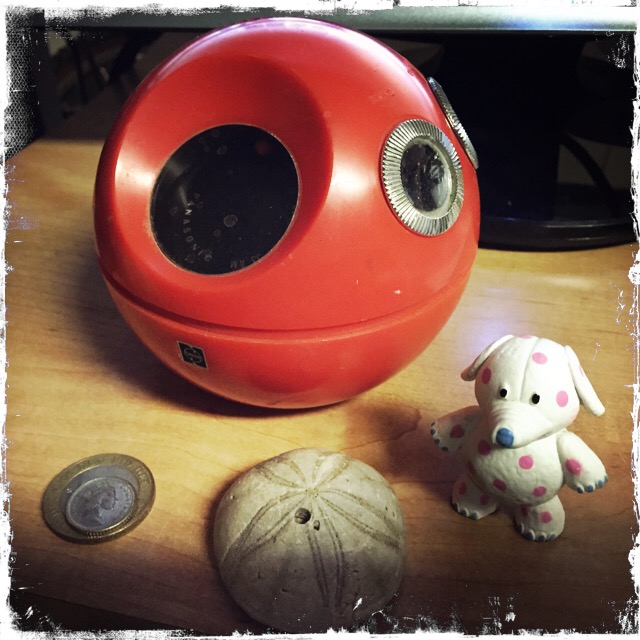 My handy-dandy Panasonic Panapet transistor radio that I’ve had since the 1970s, some odd coins, a petrified sea biscuit, and a plastic misfit toy from the Rudolph the Red-Nosed Reindeer movie. I still use my radio (I’m listening to it as I type), and it is tuned to a local AM station that plays music from the 50s, 60s, and 70s.